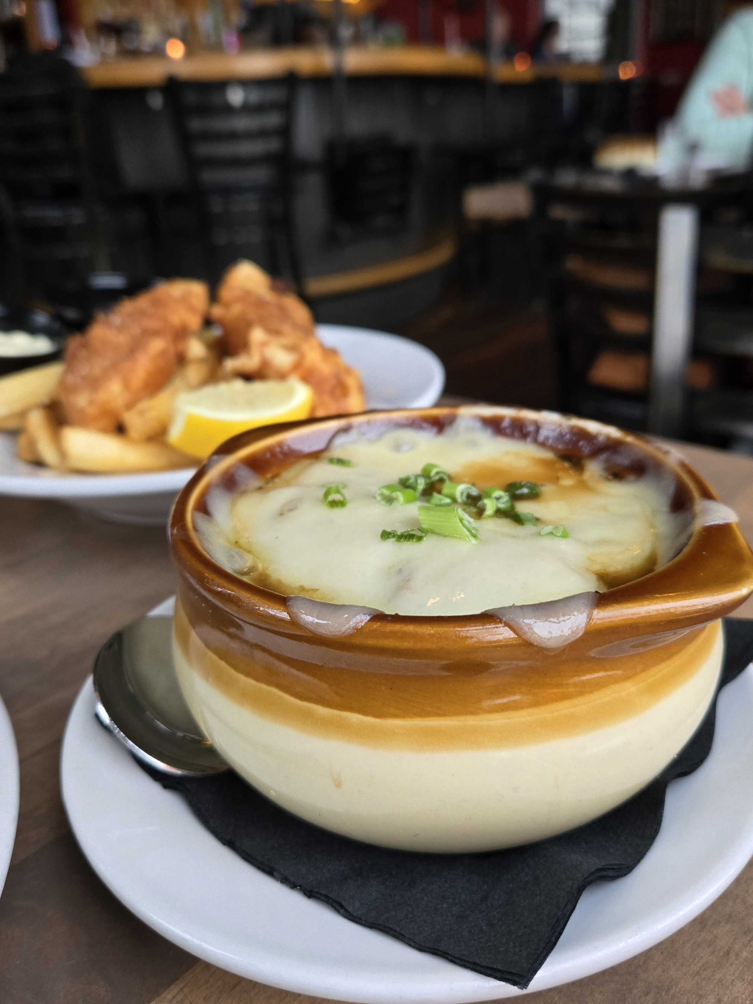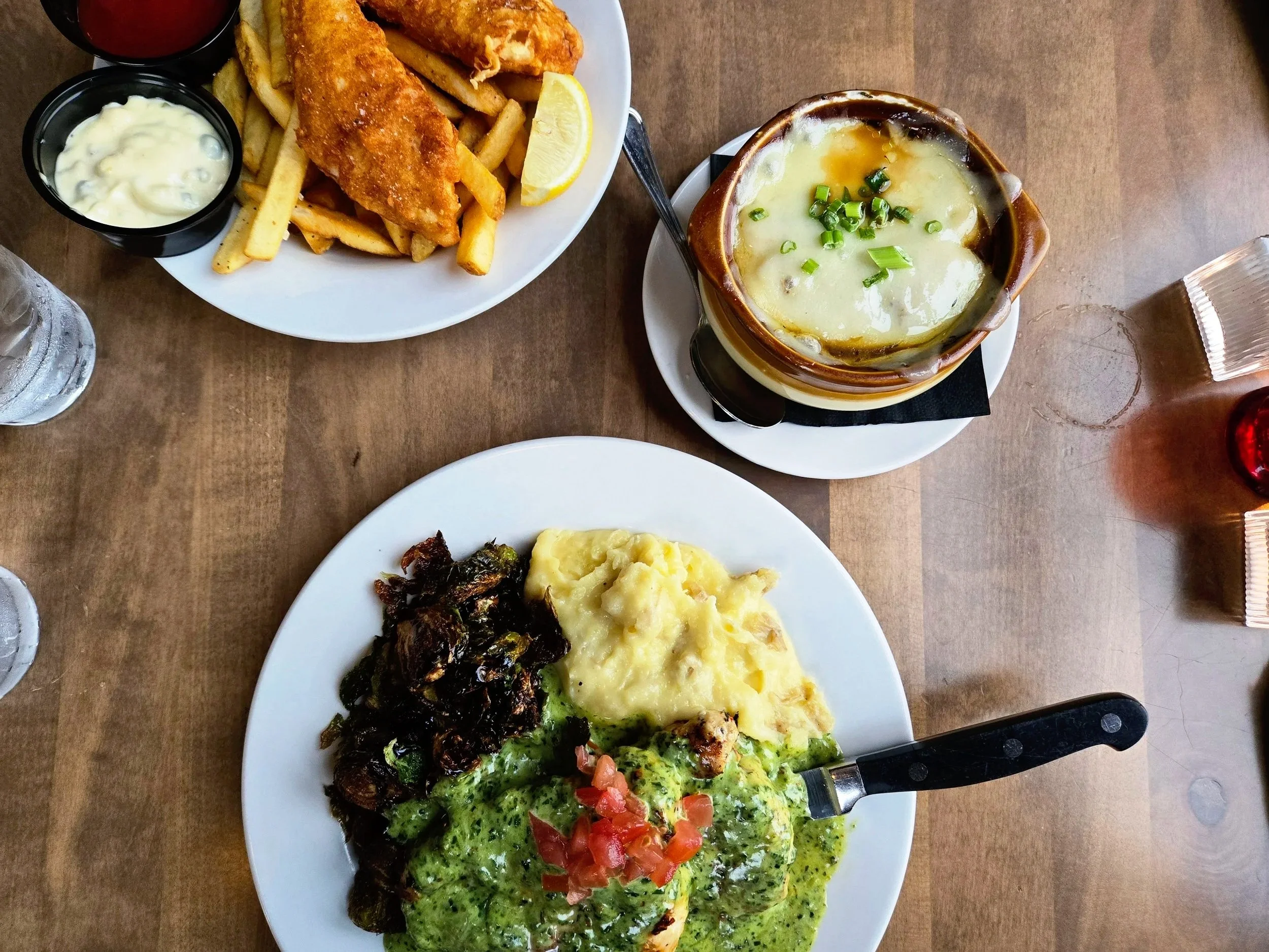 The Chicken Gouda Pesto, French Onion Soup, and Fish and Chips from The Black Cat in Bellingham